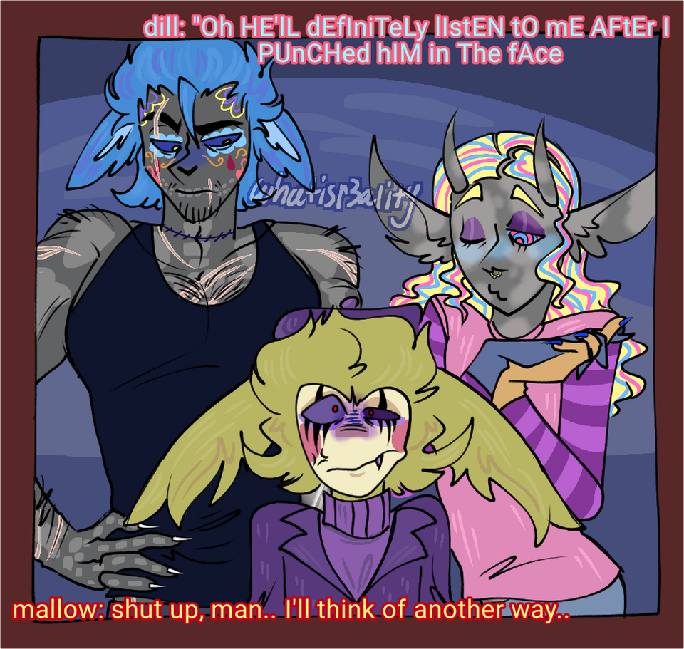 dill - a very important character, basically Lucifer's daughter. she's genderfluid and was forced to be the most perfect he could be, until being pushed to far and leaving the castle leaving Lucifer to believe he killed her as he blasted her out the window. dill became a drug addict for a long, long time before mallow and Martha found him, and helped him to become better [he dates watson and has like 3 animals]