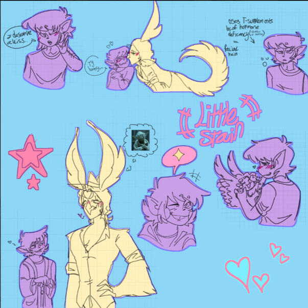Mallow, ollie, and Veronica stain are the children of Little stain and Treymon stain[married]. The twins were a gift by a mad scientist named Watson Ardvark. stain found him through connections, as he works for the king Lucifer, he wanted to have kids and he wanted to surprise his husband with them.. the two have been wanting some for so long. then he met the mad fox himself. he agreed and proceeded to make Mallow and Veronica! he thought "my, how cute" and if he could really just walk away from his beautiful creations? well! little stain asked him to be the kids uncle, to which he said YES! although, due to hells rule.. fallers[ones who died to get to hell] have negative quirks which are their personal dramatics. whenever you get over one, another appears.Watsons, sadly, is falling the first time on every invention he creates [this becomes a joke throughout the series]. and this did apply to the twins, as both of them have suffered mentally having disorders neither of the father's have.